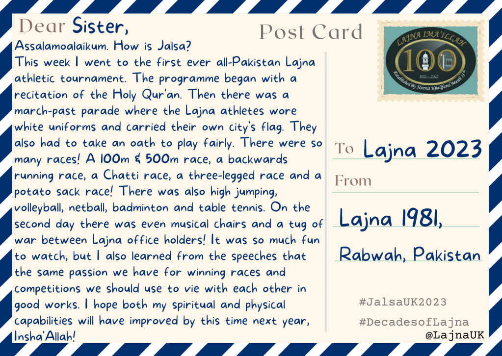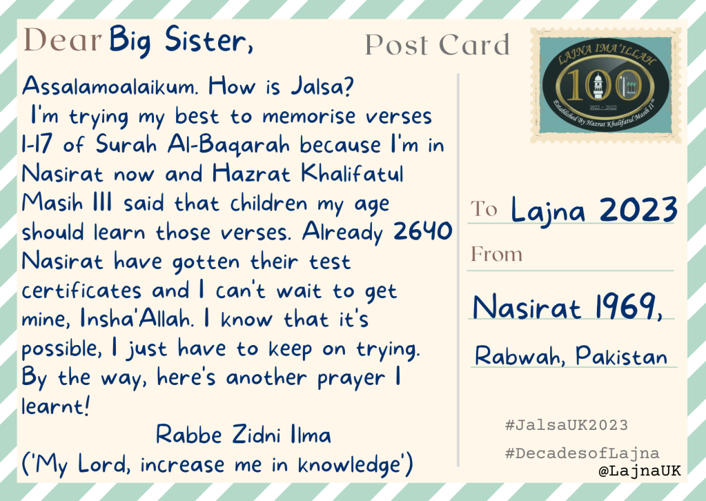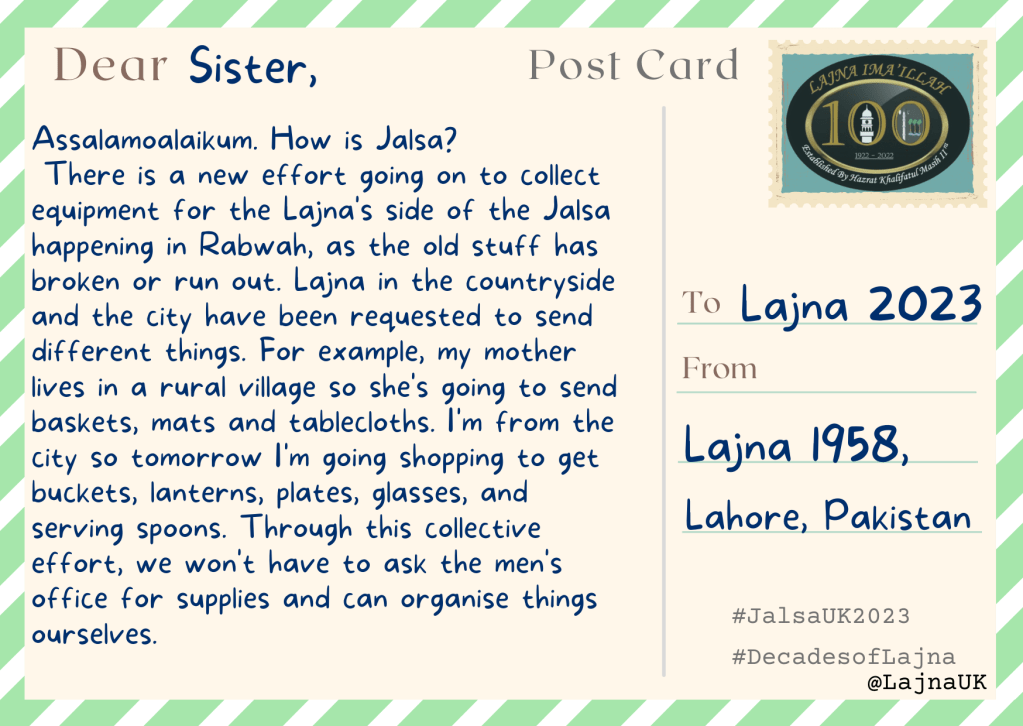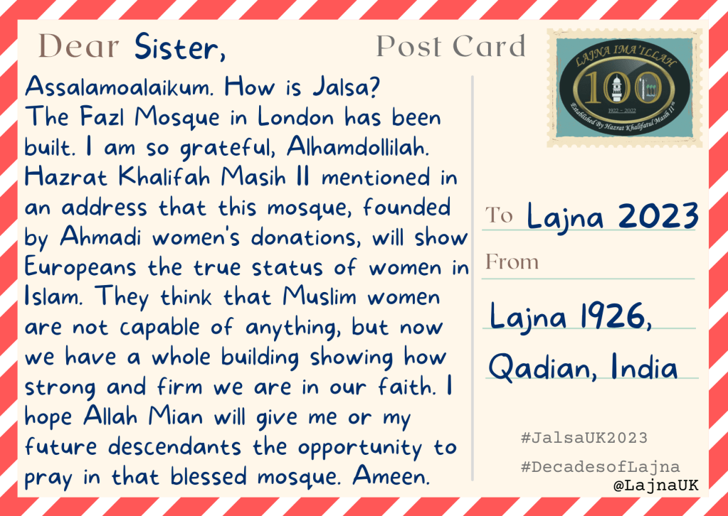 When reading these, you might like to consider what postcard you would like to leave for future generations. After all, Lajna Ima’illah’s history is still in the making, insha’Allah!