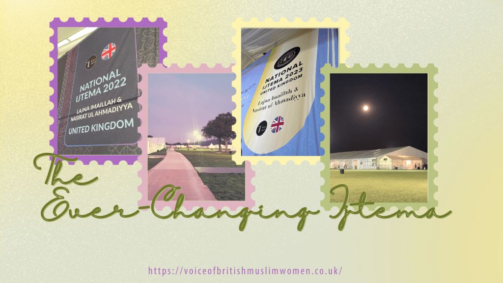 In the past couple of decades which make up my own lifespan, I have also seen many changes to the Ijtema space and programme. Just a handful of years ago, the Lajna Ijtema transformed into what I immediately thought of as a ‘mini Jalsa’ — a series of marquees set up in the middle of the countryside. I wandered around, almost bewildered by the sudden enormity of the event, the main marquee stretching out to accommodate thousands of Lajna, other marquees boasting exhibitions, another space for food, a bazaar — and was that an ice cream truck?